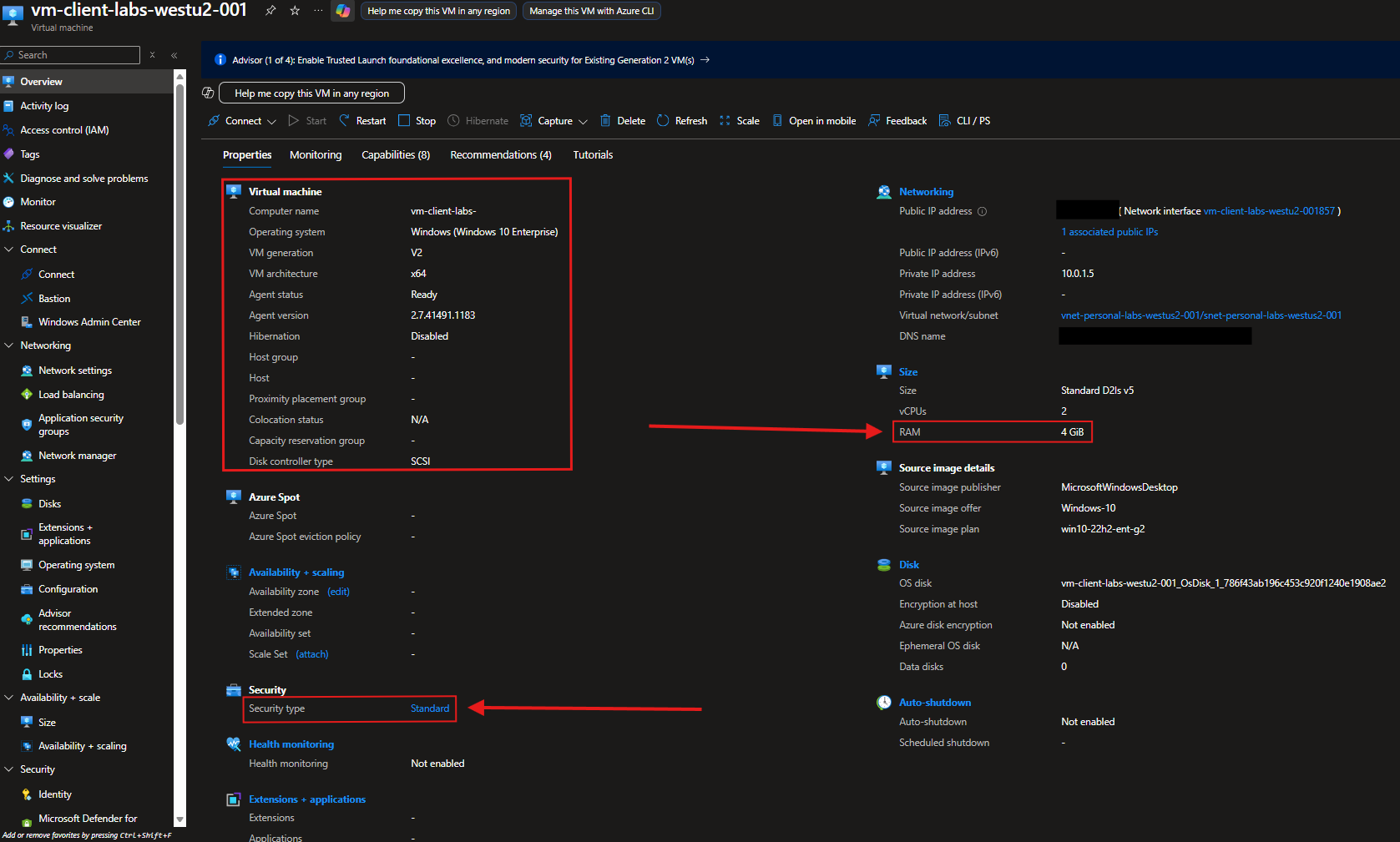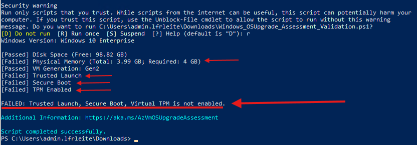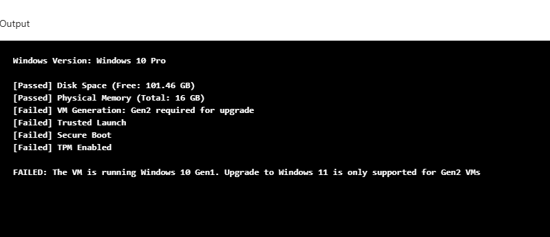 Como podemos notar, tivemos 4 pontos de falha: Trusted Launch, Secure Boot, Virtual TPM e Physical Memory (4GB)