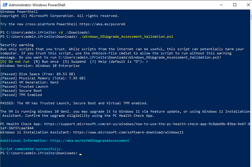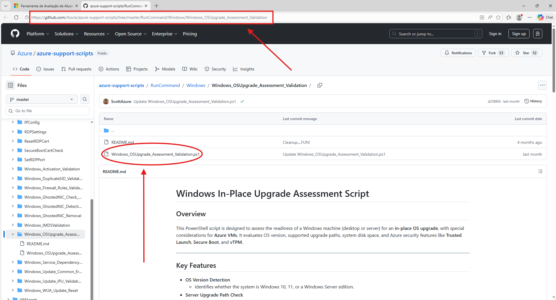 A Microsoft sugere que executemos Ferramenta de avaliação de atualização do sistema operacional Windows da VM do Azure onde valida se o Sistema Operacional possui compatibilidade com o modelo de upgrade in-place. É uma ferramenta bem simples e de fácil utilização, onde você irá realizar o download da ferramenta diretamente do repositório oficial no Github para a VM que será realizada essa atualização e executá-lo.
