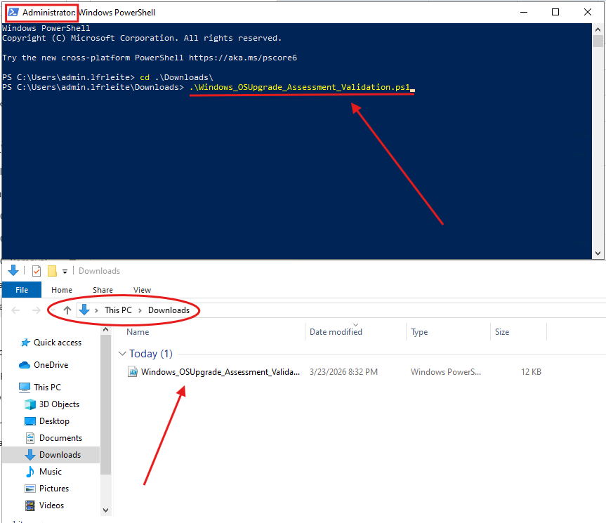 2 - Agora abra um PowerShell com privilégios elevados de administrador, navegue até onde foi salvo o Windows_OSUpgrade_Assessment_Validation.ps1 e execute-o;