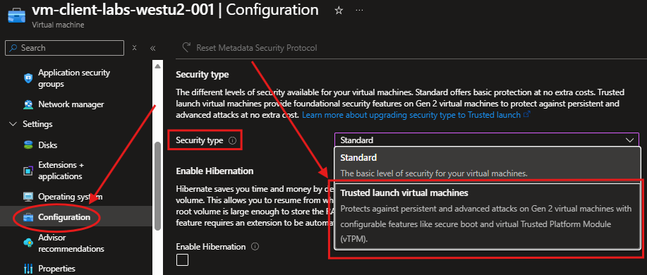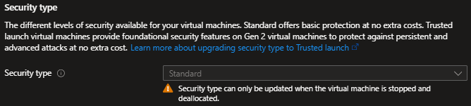 Este ‘upgrade’ do Security Type de Standard para Trusted launch virtual machines é permitido apenas uma vez, ou seja, não sendo possível reverter essa ação.