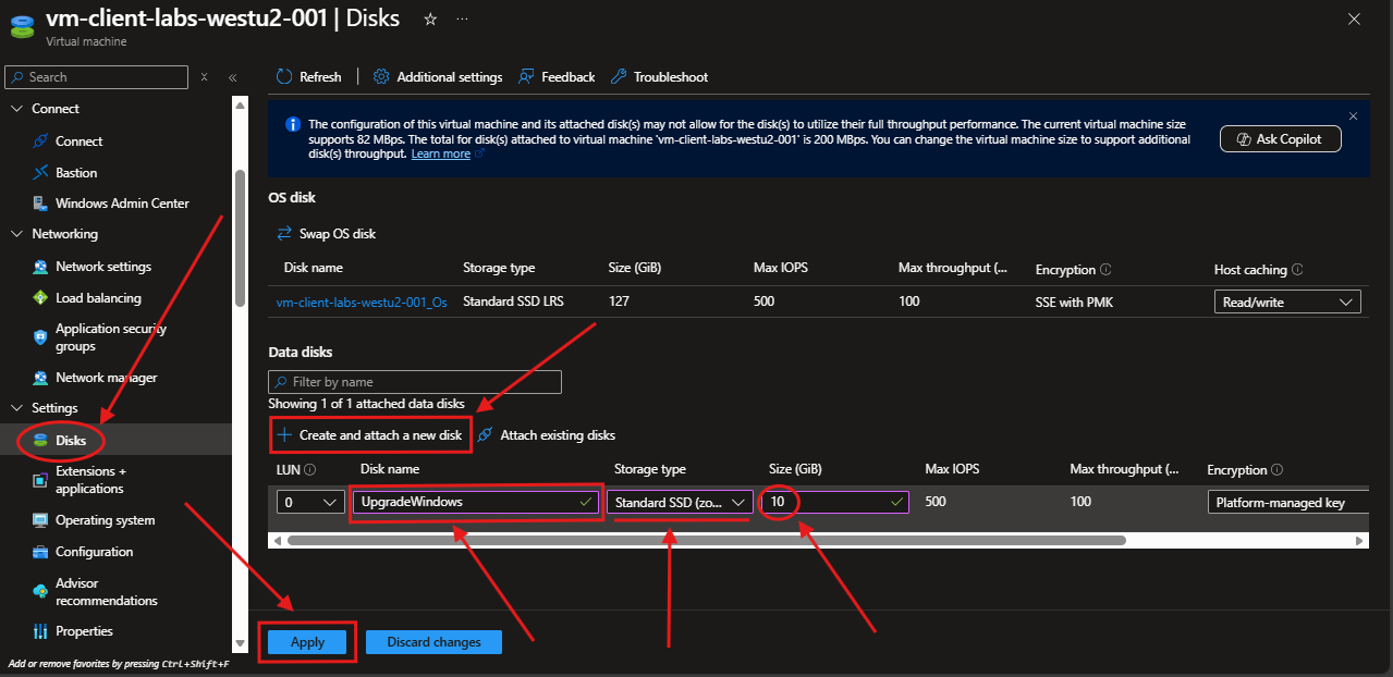 1 - No portal do Azure acesse Settings > Disks. Em Data Disks clique em + Create and attach a new disk > Insira um nome, Ex.: upgradewindows > Selecione o tipo de Storage como Standard SSD LRS > Inclua um tamanho/size de apenas 10GB e clique em aplicar/apply: