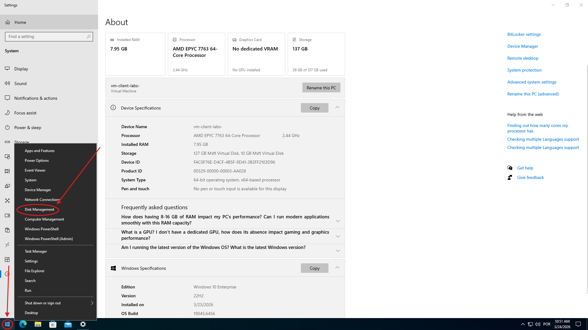 2 - Agora conecte-se via RDP ou Azure Bastion e identifique se o disco foi montado corretamente na VM. No botão do Windows, clique com o botão direito e selecione Gerenciamento de Disco (Ou Disk Management):