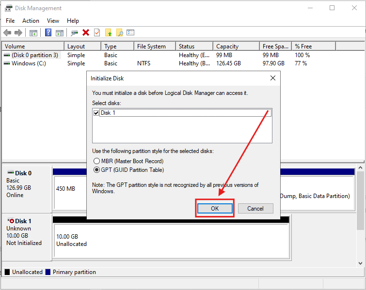 2.1 - Vai aparecer um alerta informando sobre a inicialização do disco e estará selecionado o tipo de partição como GPT, basta clicar em OK.