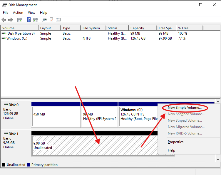 2.2 - Com o disco montado, agora precisaremos formatá-lo, para isso basta clicar com o botão direito e mcima do disco 1 (ou o número do disco que aparecerá caso tenha mais de um disco de dados) e clique em New Simple Volume… > Clique em Next > Mantenha o volume total do disco e clique em Next > Caso queira mudar a letra pode realizar a alteração e clicar em Next > Em Volume label: entre com um nome amigável como Windows Upgrade por exemplo e clique em Next > E por fim clique em Finish.