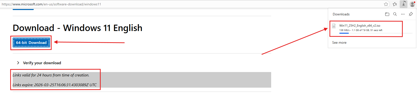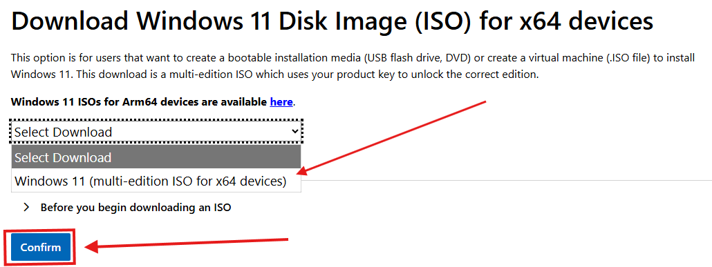 3 - Com o disco devidamente montado e disponível, vamos fazer o download da ISO oficial diretamente no site da Microsoft, acesse diretamente pelo link https://www.microsoft.com/en-us/software-download/windows11. Na página de download da ISO aparecerão 3 opções: Windows 11 Installation Assistant | Create Windows 11 Installation Media | Download Windows 11 Disk Image (ISO) for x64 devices. Para realizar o download da ISO basta descer a página até a seleção da ISO, após selecionar clica em confirm