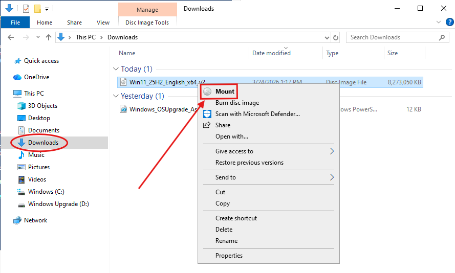4 - Agora podemos montar a ISO e em seguida extrair o conteúdo para o disco de dados. Para isso acesse a pasta Downloads, clique com o botão direito na ISO e selecione Mount, logo em seguida aparecerá uma mensagem informando se gostaria de abrir o arquivo, basta clicar em Open: