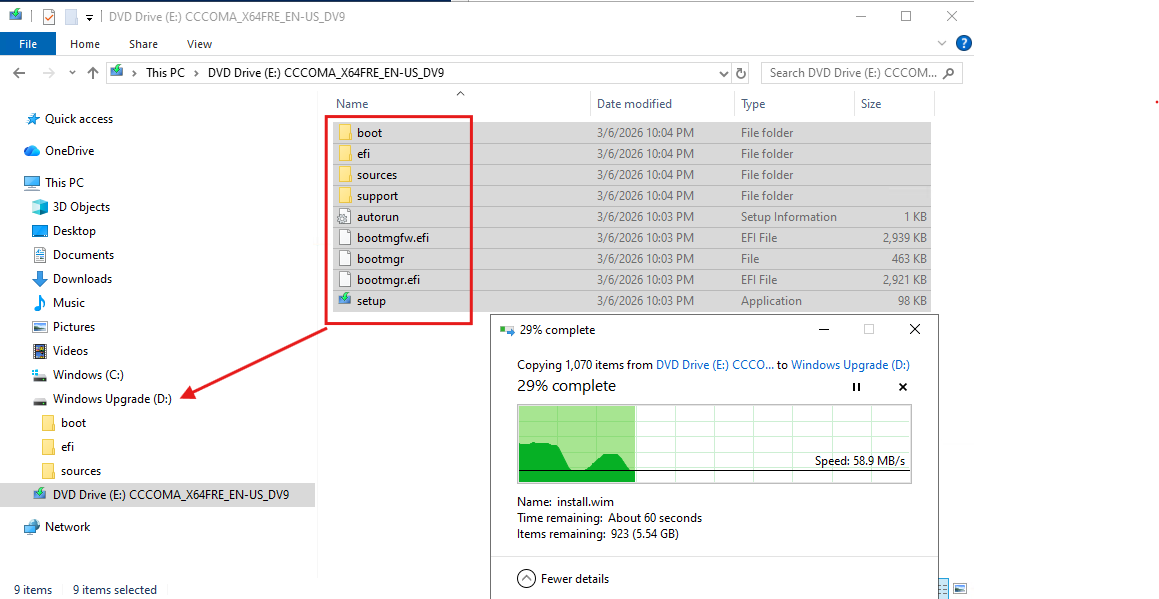 5 - Acesse a unidade montada (geralmente com o nome DVD Drive), selecione todo o conteúdo e copie para o disco que criamos anteriormente, neste exemplo utilizando a Unidade D: com o nome de Windows Upgrade: