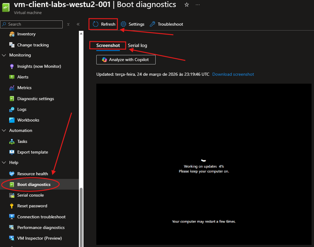 Nesse momento, você pode acompanhar o progresso por meio da funcionalidade de screenshot / boot diagnostics no portal do Azure, o que é muito útil quando a VM ainda não voltou para acesso remoto: